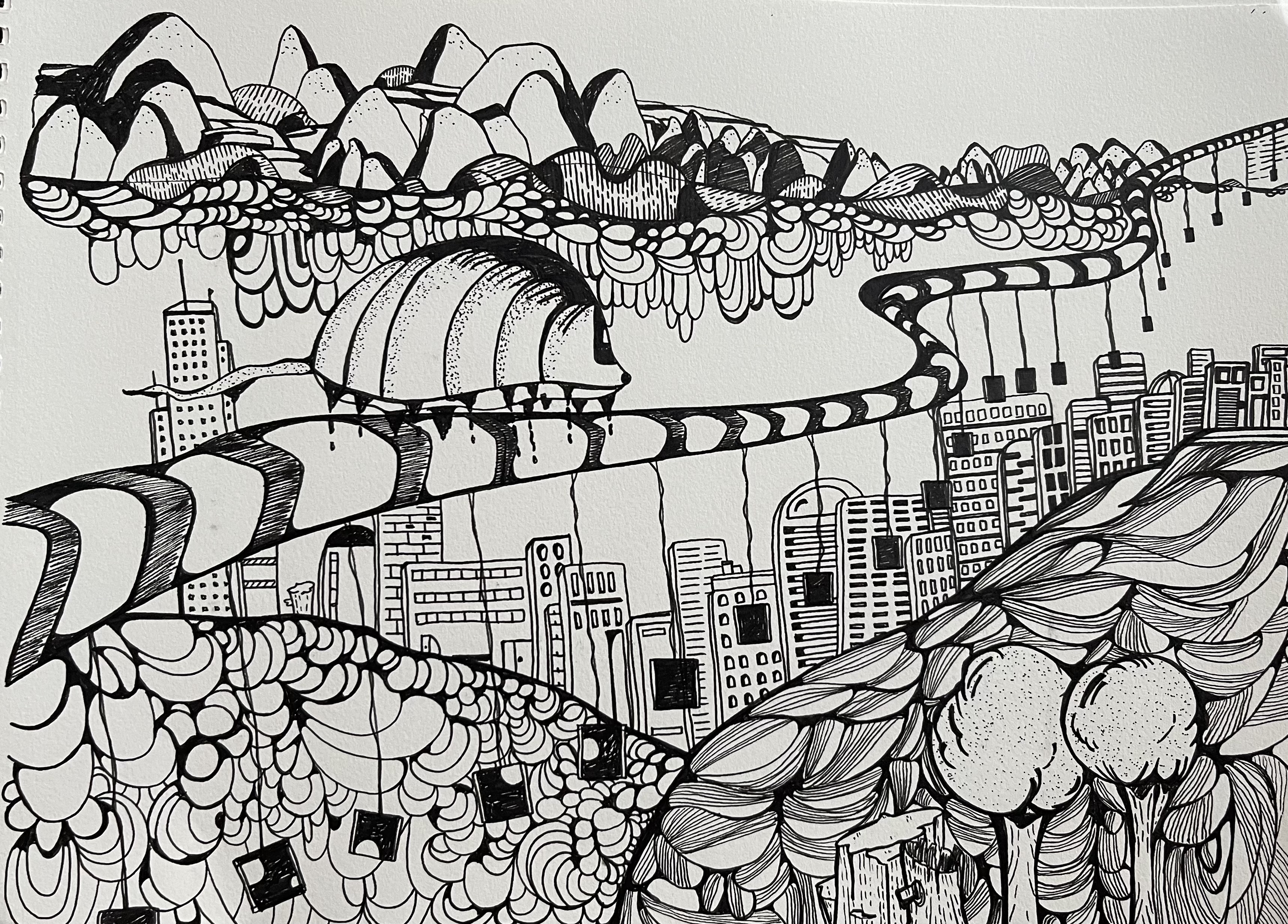 Bu çizimlere uçak korkusu yaşadığım bir uçuşta başladım. Bu çizimler 0.3, 0.5, 0.7 ve hatta 0.03 teknik kalemler kullanılarak ön hazırlık yapmadan, meditasyon yöntemi olarak çizilmektedir.